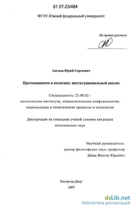 Несмотря на обилие работ, в которых затрагивались отдельные аспекты протекционизма стоит подчеркнуть, что институциональный анализ явления протекционизма в политике, в отечественной политической науке не проводился.