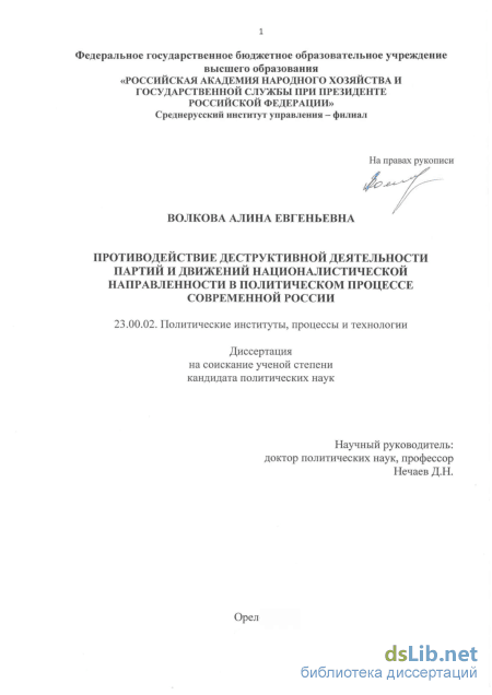 В-пятых, деятельность органов государственной власти и управления Российской Федерации по противодействию деструктивной деятельности националистических партий и движений в период с 1992 по 2015 гг. представляет собой субпроцесс общего политического процесса. Данная деятельность осуществлялась в рамках политического порядка, обобщенной категории политической организованности и противостоящей политическому хаосу государственного управления.