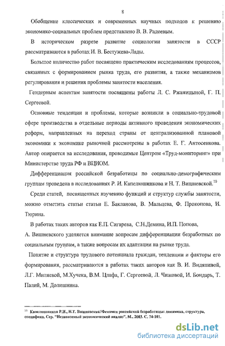 10 Капелюшников Р.И., Н.Т. Вишневская//Феномен российской безработицы: динамика, структура, специфика. Сер. "Независимый экономический анализ". М., 2003. С. 74-101.