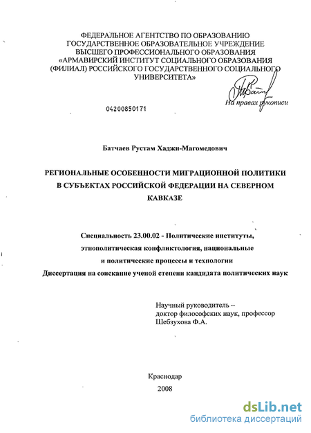 Необходимо особо отметить работы СБ. Ягодина и А.Д. Назарова,9 в которых был осуществлен анализ правовых аспектов формирования государственной миграционной политики. Был сделан важный вывод о сохраняющейся неполноте системы нормативных актов РФ, конкретизирующих содержание посвященных миграции федеральных законов и об отсутствии комплексного подхода к регулированию миграционных процессов. Опыт регулирования миграции правовыми методами анализировали такие авторы, как П. Полян, О. Чернышева, Н. Зинченко. " Представляет интерес защищенная в Кубанском государственном университете в 2002г. диссертация Е.В. Волосенковой «Государство как субъект управления миграционными процессами в современной России: на примере Краснодарского края», в котором вопросы формирования миграционной политики рассматриваются на примере отдельного субъекта Федерации.