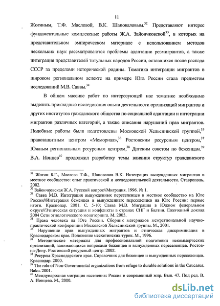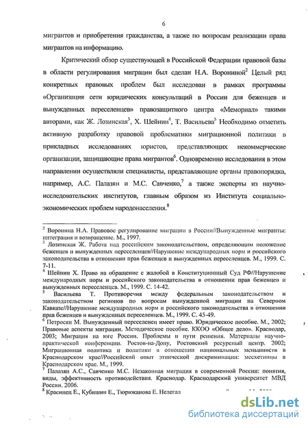 Критический обзор существующей в Российской Федерации правовой базы в области регулирования миграции был сделан Н.А. Ворониной2 Целый ряд конкретных правовых проблем был исследован в рамках программы «Организация сети юридических консультаций в России для беженцев и вынужденных переселенцев» правозащитного центра «Мемориал» такими авторами, как Ж. Лозинская , X. Шейнин , Т. Васильева Необходимо отметить активную разработку правовой проблематики миграционной политики в прикладных исследованиях юристов, представляющих некоммерческие организации, защищающие права мигрантов6. Одновременно исследования в этом направлении осуществляли специалисты, представляющие органы правопорядка, например, А.С. Палазян и М.С. Савченко, а также эксперты из научно-исследовательских институтов, главным образом из Института социально-экономических проблем народонаселения.8