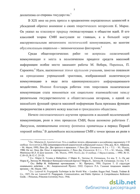 1 ' См.: Comparative Politics Today: A World View / Ed. by G. Almond, D. Powell - New York: Harper Collins, 1996; Брайант Дженнингз, Томпсон Сузан. Основы воздействия СМИ/ Пер. с англ./ Д.Брапант, С.Томпсон. - М.: Издательский дом «Вильяме», 2004; Бурдье Пьер. Социология политики / Пер. с фр./ П. Бурдье. - М.: Socio-Logos, 1993; Easton D. Framework for Political Analysis/ D. Easton. - Chicago: University of Chicago Press, 1979; Gurevitch M., Blumer J. Political communication systems and democratic values/ M.Gurevitch, J. Blumer. - Cambridge: Cambridge University Press. 1990; Katz, E. On conceptualizing media effects/ E. Katz. - Newbury Park, CA: Sage, 1983; Lasarsfeld P. The effects of mass-media/ P. Lasarsfeld. - New York: Columbia University Bureau of Applied Social Research. 1949; Lassweli H. The Structure and Function of Communication in Society/ H. Lassweli. - N.Y.: Vail-Ballou Press, 1948; McLeod J.M., Kosicki G.M. The expanding boundaries of political communication effects/J.M. McLeod, G.M. Kosicky. - Hillsdale: Erlbaum, 1994; McLuhan M. Understanding media: The extensions of man/ M. McLuhan. - New York: McGraw-Hill, 1964; Роджерс Э. Коммуникационная технология. Новые средства массовой коммуникации в обществе/ Э. Роджерс. - М.: ИНИОН, 1987; Сиберт С, Шрамм У., Питерсон Т. Четыре теории прессы/ С. Сиберт, У. Шрамм, Т.Питерсон. - М.: Национальный институт прессы, 1998; Хабермас Ю. Демократия. Разум. Нравственность/10. Хабермас. - М.: Наука, 1995