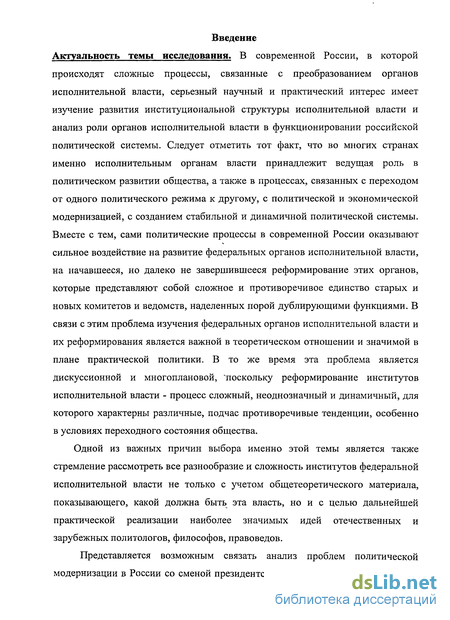 марте 2000 года. Переход властных полномочий к В.В.Путину повлек за собой существенные изменения в политической системе современной России и, прежде всего, повлиял на роль федеральных органов исполнительной власти. Вместе с тем, подобные политические изменения актуализируют задачи научного и практически политического исследования с тем, чтобы властные структуры и общество имели возможность сопоставления различных вариантов, точек зрения и сценариев развития. Это особенно важно в свете проводимой в России административной реформы, которая призвана существенно повысить эффективность функционирования исполнительной власти и всей политической системы. При этом на эффективность работы федеральных органов исполнительной власти значительное влияние оказывает характер политического режима, который опосредует взаимодействие этих органов с другими структурами политической системы.