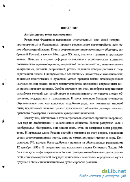 Российская Федерация переживает ответственный этап своей истории -противоречивый и болезненный процесс радикального переустройства всех основ общественной жизни. Путь к современному цивилизованному обществу, выбранный Россией в начале 90-х годов XX века, оказался трудным и противоречивым. Начатые в стране реформы осложнились экономическим кризисом, политическим противоборством, социальной нестабильностью, национальными конфликтами, аномией, депривацией, резким падением доверия россиян к государственной власти. Одновременно с болезненным демонтажем экономических, социально-политических и духовных устоев прежней жизни активизировались научные поиски модели нового жизнеустройства, адекватной современным тенденциям мирового развития. Особое значение при этом приобрела теоретическая разработка условий для устойчивого и конструктивного консенсуса между обществом, государством и гражданином. И здесь возникли большие сложности, обусловленные тем, что консенсус подобного рода, как показывает мировой опыт, предполагает наличие зрелого гражданского общества, демократического правового государства и свободных суверенных личностей.