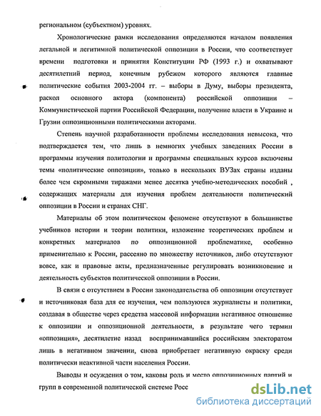 Хронологические рамки исследования определяются началом появления легальной и легитимной политической оппозиции в России, что соответствует времени подготовки и принятия Конституции РФ (1993 г.) и охватывают десятилетний период, конечным рубежом которого являются главные политические события 2003-2004 гг. - выборы в Думу, выборы президента, раскол основного актора (компонента) российской оппозиции -Коммунистической партии Российской Федерации, получение власти в Украине и Грузии оппозиционными политическими акторами.