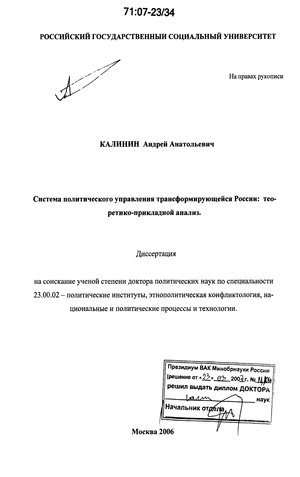 Определенную помощь в решении поставленных в диссертации задач оказали работы преподавателей кафедры политологии и политической психологии Гуманитарного факультета РГСУ: Г.И. Авциновой, А.Л. Гуторовой, Б.И. Краснова, Л.Г. Лаптева, Е.Н. Тарасова, О.А. Белькова, Ю.В. Ярмака и т.д.2 В работе Академика РАН В.И. Жукова3 рассматриваются последствия политики перестройки и радикального реформирования России, предлагается оптимальная для страны социально-политическая и управленческая модель, анализируются место и роль страны в системе глобальных социальных координат. Это способствовало углубленному изучению социальных аспектов особенностей, тенденций и противоречий трансформации систем политического управления России, исследованию сущностных аспектов функционирования современной модели политического управления, ее эффективности и перспектив развития. Для нашего исследования ценность работ В.И. Жукова и в том, что часть из них посвящена методологии математического моделирования управления социальными процессами4. Математическое моделиро-