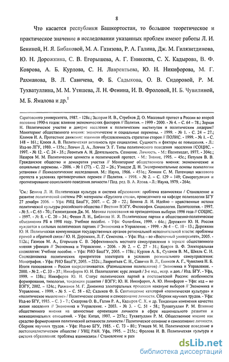 8 Что касается республики Башкортостан, то большое теоретическое и практическое значение в исследовании указанных проблем имеют работы Л. И. Бениной, Н. Я. Бибаковой, М. А. Газизова, Р. А. Галина, Дж. М. Гилязитдинова, Ю, Н. Дорожкина, С. В. Егорышева, А. Г. Еникеева, С. X. Кадырова, В. Ф. Коврова, А. Б. Курлова, С. Н. Лаврентьева, Ю. Н. Никифорова, М. Г. Рахманова, В. Л. Савичева, Ф. Б. Садыкова, О. В. Сидоровой, Р. М. Тухватуллина, М. М. Утяшева, Л. Н. Фенина, И. В. Фроловой, Н. Б. Чувилиной, М. Б. Ямаловаи др.1