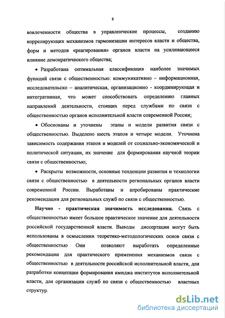 Изучен и обобщен международный и российский опыт связи с общественностью в органах государственной власти, на основе которого определены наиболее эффективные механизмы связи с общественностью, выявлена специфика и проблемы функционирования в деятельности исполнительной власти с учетом задач, стоящих перед исполнительной властью современной России.