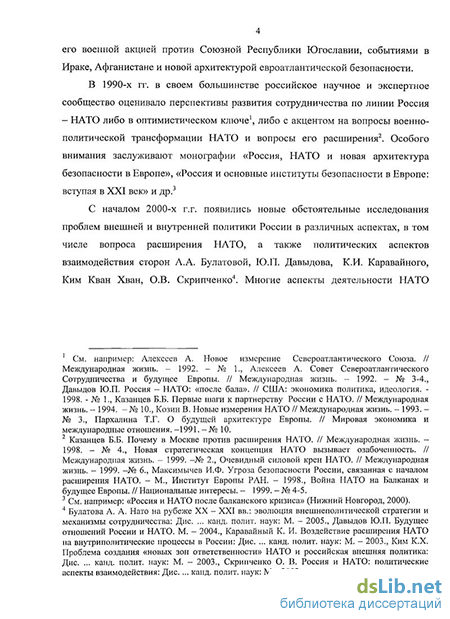 Степень научной разработанности темы. В большинстве научных статей и диссертационных исследований, посвященных взаимоотношениям России и НАТО, эволюция отношений двух сторон, процесс поиска путей взаимодействия сторон и механизмы сотрудничества обсуждаются, прежде всего, в непосредственной связи с трансформацией и расширением Альянса, его военной акцией против Союзной Республики Югославии, событиями в Ираке, Афганистане и новой архитектурой евроатлантической безопасности.