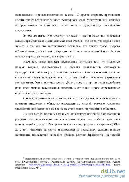 В течение всей своей истории Россия пережила множество сложных этапов развития, таких как войны (мировые, гражданские), кризисы (политические, экономические, духовные), реформации и многое другое. Именно в такие периоды и власть и граждане пытались осознать, что за сила объединяет народы, проживающие на территории страны. Исходя из данных статистических отчетов в России насчитывается около двухсот различных национальных принадлежностей населения1. С другой стороны, противники России так же ведут поиски этого культурного звена, уничтожив или, изменив которое можно нанести вред целостности и суверенитету российского государства.