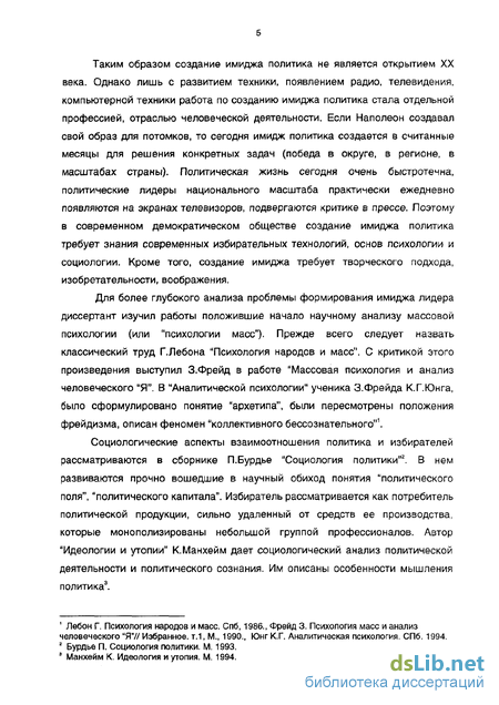 Для более глубокого анализа проблемы формирования имиджа лидера диссертант изучил работы положившие начало научному анализу массовой психологии (или "психологии масс"). Прежде всего следует назвать классический труд Г.Лебона "Психология народов и масс". С критикой этого произведения выступил З.Фрейд в работе "Массовая психология и анализ человеческого "Я". В "Аналитической психологии" ученика З.Фрейда К.Г.Юнга, было сформулировано понятие "архетипа", были пересмотрены положения фрейдизма, описан феномен "коллективного бессознательного"1.