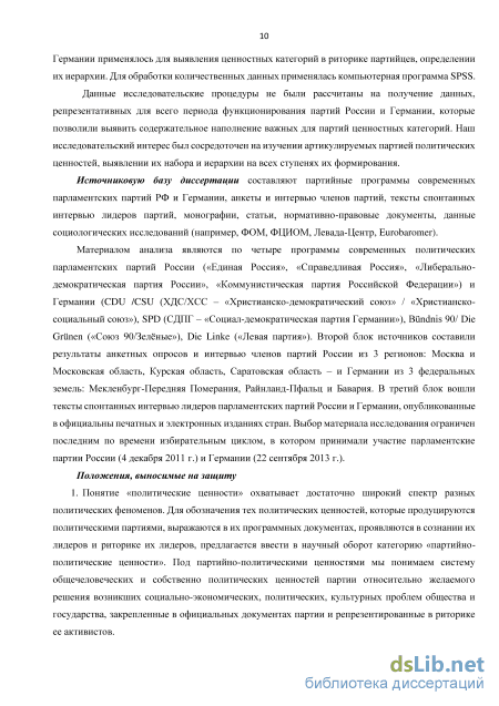 Сочетание качественных и количественных методов сбора и анализа данных является наиболее адекватным в области исследования политических ценностей партий. Так, традиционный анализ текстов применялся для определения факторов, которые влияют на формирование набора и иерархии ценностных категорий. Контент-анализ использовался для содержательного исследования партийных документов и текстов спонтанных интервью лидеров, а также для выявления индикаторов ценностных категорий. Проведение опроса в форме анкетирования и глубинного формализованного интервью рядовых членов парламентских партий России и полит. наук. Москва, 2012. Германии применялось для выявления ценностных категорий в риторике партийцев, определении их иерархии. Для обработки количественных данных применялась компьютерная программа SPSS. Данные исследовательские процедуры не были рассчитаны на получение данных, репрезентативных для всего периода функционирования партий России и Германии, которые позволили выявить содержательное наполнение важных для партий ценностных категорий. Наш исследовательский интерес был сосредоточен на изучении артикулируемых партией политических ценностей, выявлении их набора и иерархии на всех ступенях их формирования.