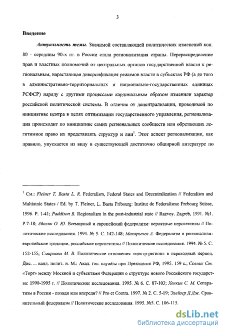См.: Fleiner Т, Basta L. R. Federalism, Federal States and Decentralization // Federalism and Multiatnic States I Ed. by T. Fleiner, L. Basta Fribourg: Institut de Federalisme Frebourg Suisse, 1996. P. 1-41; Paddison R. Regionalism in the post-industrial state // Razvoy. Zagreb, 1991. №1. P.7-18; Аболин О. Ю. Всемирный и европейский федерализм: вероятные перспективы // Политические исследования. 1994. № 5. С. 142-148; Макарычев А. Федерализм и регионализм: европейские традиции, российские перспективы // Политические исследования. 1994. № 5. С. 152-155; Смирнова М. В. Политические отношения «центр-регион» в переходный период. Дис. ... канд. полит, и. М: Акад. гос. службы при Президенте РФ, 1995. 159 с; Солник Ст. «Торг» между Москвой и субъектами Федерации о структуре нового Российского государства: 1990-1995 г. // Политические исследования. 1995. № 6. С. 87-103; Хенкин С. М. Сепаратизм в России - позади или впереди? // Pro et Contra. 1997. № 2. С. 5-19; Элейзер Д.Дж. Сравнительный федерализм // Политические исследования. 1995. №5. С. 106-115.