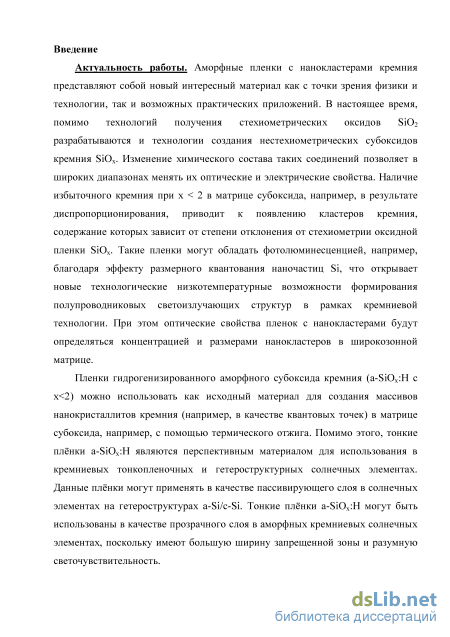 Известно, что в зависимости от условий формирования наночастицы кремния могут характеризоваться как наличием, так и отсутствием дальнего порядка в окружении атомов. В первом случае мы имеем дело с нанокристаллами кремния (nc-Si), во втором - с аморфными нанокластерами кремния (ncl-Si). При этом для формирования нанокристаллов требуются существенно более высокие температуры, в то время как нанокластеры образуются при существенно меньших температурах. Рассмотрим более подробно исследования по получению аморфной матрицы субоксида кремния, содержащей аморфные нанокластеры кремния.