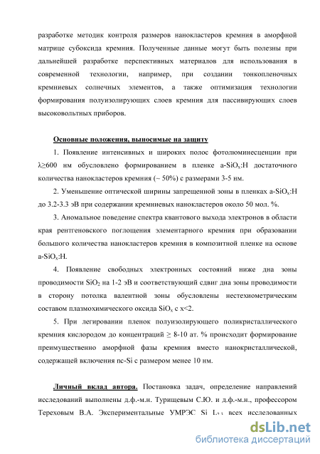 Личный вклад автора. Постановка задач, определение направлений исследований выполнены д.ф.-м.н. Турищевым С.Ю. и д.ф.-м.н., профессором Тереховым В.А. Экспериментальные УМРЭС Si L2,3 спектры всех исследованных образцов получены лично автором и проанализированы с д.ф.-м.н., профессором Тереховым В.А. и д.ф.-м.н. Турищевым С.Ю. Синхротронные спектры КВ Si L2,3 впервые получены лично автором в составе научной группы ВГУ под руководством д.ф.-м.н. Турищева С.Ю. Результаты фотолюминесценции, спектры оптического поглощения и данные по рентгеновской дифракции получены лично автором совместно с сотрудниками ВГУ (Минаков Д.А., Середин П.В., Румянцева Н.А.). Анализ электронного строения, фазового состава и оптических свойств был проведен лично автором. Обсуждение результатов проводилось совместно с научным руководителем д.ф.-м.н. Турищевым С.Ю., д.ф.-м.н., профессором Тереховым В.А., д.ф.-м.н., профессором Домашевской Э.П. Основные результаты и выводы получены лично автором.