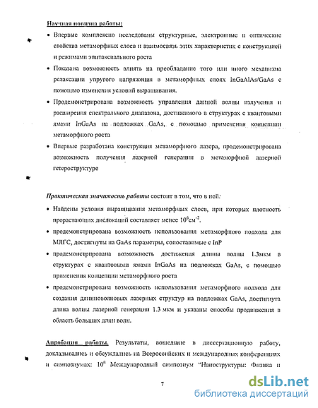 Найдены условия выращивания метаморфных слоев, при которых плотность прорастающих дислокаций составляет менее 106см*2. продемонстрирована возможность использования метаморфного подхода для МЛГС, достигнуты на GaAs параметры, сопоставимые с InP продемонстрирована возможность достижения длины волны І.Змкм в структурах с квантовыми ямами InGaAs на подложках GaAs, с помощью применения концепции метаморфного роста продемонстрирована возможность использования метаморфного подхода для создания длинноволновых лазерных структур на подложках GaAs, достигнута длина волны лазерной генерации 1.3 мкм и указаны способы продвижения в область больших длин волн.