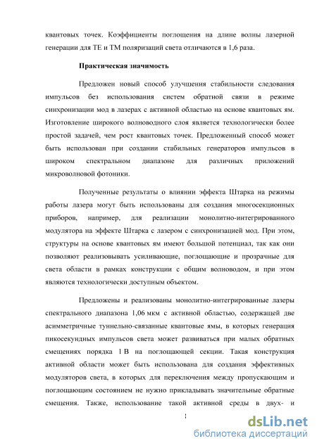 смещениях порядка 1 В на поглощающей секции. Такая конструкция активной области может быть использована для создания эффективных модуляторов света, в которых для переключения между пропускающим и поглощающим состоянием не нужно прикладывать значительные обратные смещения. Также, использование такой активной среды в двух- и многосекционных конструкциях лазеров может улучшить рабочие характеристики (надежность и срок службы) в приборах на их основе.
