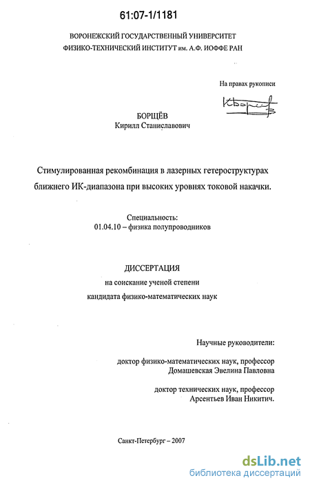 Диссертационная работа выполнена в лаборатории «Полупроводниковой люминесценции и инжекционных излучателей» ФТИ им. А.Ф.Иоффе РАН и на кафедре Физики твёрдого тела и наноструктур Воронежского государственного университета в соответствии с планом научно-исследовательских работ.