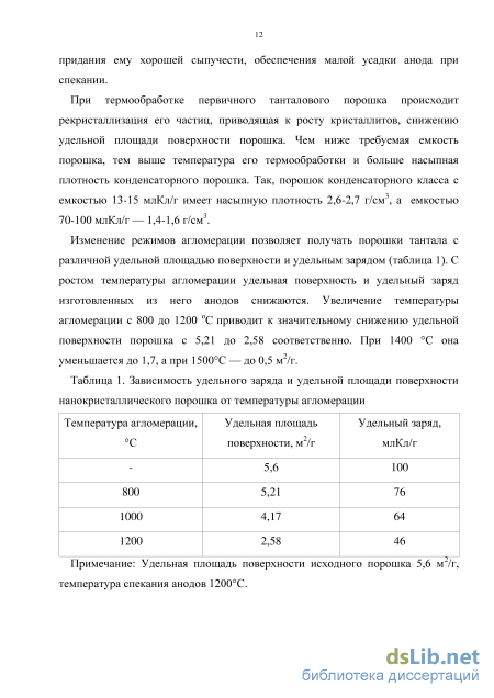 Улучшение прессуемости высокоемких порошков обычно достигалось путем их соответствующей агломерации. Исследовано влияние термообработки в интервале температур 800-1600 С и легирование фосфором на изменение характеристик порошков и анодов. Термообработку проводили в вакууме при остаточном давлении не ниже 510-5 мм. рт. ст. или в атмосфере высокочистого аргона. Образовавшийся спек размалывали до крупности не менее 3 - 15 мкм. Приведенные данные показывают, что термообработка в интервале температур 11001300 С в атмосфере высокочистого аргона (исключающая взаимодействие тантала с остаточными газами атмосферы печи), но не исключающая загрязнение поверхности примесями внедрения, приводит к значительно большему уменьшению удельной поверхности. Легирование фосфором не влияет на величину изменения удельной поверхности. В то же время аноды, изготовленные из порошков, легированных фосфором, даже после термообработки имеют гораздо меньшую усадку, но большую величину удельного заряда. Авторы предполагают, что увеличение удельного заряда при легировании фосфором происходит главным образом за счет уменьшения спекаемости, т.е. в результате снижения доли удельной поверхности при образовании межчастичных контактов. Для повышения насыпного веса порошков и улучшения текучести термообработке подвергались предварительно спрессованные порошки. Таким способом получены порошки с зарядом до 14 млКл/г, насыпным весом 2,2 2,5 г/см3 и хорошей текучестью.