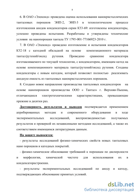 В процессе испытаний в качестве эталона были использованы лучшие танталовые порошки, производимые мировым лидером фирмой «Starck». Токи утечки нанопорошков в 5 раз ниже, чем у порошков известной фирмы «Starck» (см. табл. 17). Это свидетельствует о достигнутой высокой химической чистоте и бездефектной структуре полученных порошков, так как эти параметры взаимосвязаны. Полученные результаты дают основание полагать о появлении возможности по разработке конденсаторов с габаритными размерами в 2-5 раз более меньшими по отношению к существующему уровню. Полученные данные обобщены, и на их основе разработаны технологические инструкции (приложены в диссертации) по работе с электролитическими порошками в условиях действующего производства ОАО «Элеконд», которые являются основой технологии по созданию микроминиатюрного объемно-пористого анода. Получен патент: «Способ изготовления объемно-пористых анодов электролитических конденсаторов». Разработаны и утверждены технические условия на нанопорошки тантала ТУ 1795-001-77166923-2010 г.