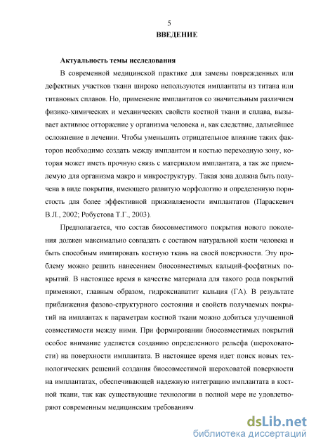 В современной медицинской практике для исправления дефектов костной основы или замены поврежденных участков ткани используются им-плантаты из титана и титановых сплавов. Но, применение имплантов со значительным различием физико-химических и механических свойств сплава и костной ткани, вызывает активное отторжение у организма и осложнения в лечении. Для уменьшения отрицательного влияния этих факторов необходимо создать между костью и имплантатом переходную зону, которая наряду с прочной связью с материалом имплантата должна иметь приемлемую для организма макро и микроструктуру. Такая зона должна быть получена в виде покрытия, имеющего определенную пористость, развитую морфологию, что требуется для эффективной приживляемости имплантатов (Параскевич В.Л., 2002; Робустова Т.Г., 2003). Предполагается, что состав этого покрытия должен максимально совпадать с составом натуральной кости или быть способным имитировать костную ткань на своей поверхности. Наиболее распространенным решением этой проблемы является нанесение биоактивных кальций-фосфатных покрытий. В настоящее время в качестве биоактивного материала для покрытий применяют, главным образом, гидроксиапатит (ГА). Улучшение совместимости имплантатов с покрытиями может обеспечиваться благодаря приближению их фазово-структурного состояния и свойств к параметрам костной ткани. При создании биосовместимых покрытий особое внимание уделяется формированию определенного рельефа (шероховатости) на поверхности имплантата. Имплантационные материалы нового поколения должны так же обладать высокой твердостью и прочностью на сжатие и растяжение, превосходными износо- и коррозионной стойкостями, низким модулем упругости, а также биосовместимостью.