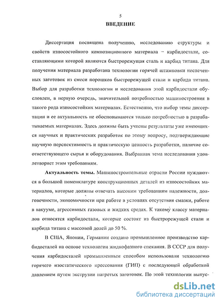 Таким образом, комплексное исследование фазового состава, структуры и свойств горячештампованной карбидостали «быстрорежущая сталь - карбид титана» для производства высокоизносостойких материалов и изделий, которые после штамповки не нуждаются или нуждаются лишь в незначительной механической обработке, а также создание научно-обоснованной технологии получения карбидосталей посредством подготовки порошкового сырья к переработке, холодного уплотнения и горячей штамповки порошковых заготовок, является актуальной научной и практической задачей в сфере порошковой металлургии и композиционных материалов.