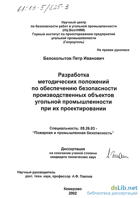 Белокопытов Петр Иванович. Разработка методических положений по обеспечению безопасности производственных объектов угольной промышленности при их проектировании : диссертация ... кандидата технических наук : 05.26.03.- Кемерово, 2002.- 121 с.: ил. РГБ ОД, 61 03-5/825-3