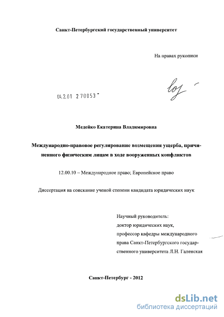 Апробация результатов исследования. Диссертация подготовлена на кафедре международного права юридического факультета Санкт-Петербургского государственного университета, где проведены ее обсуждение и рецензирование. Основные теоретические положения и сделанные в результате исследования выводы нашли свое отражение в опубликованных автором научных статьях, а также в докладах на конференциях, где они были уточнены и подтверждены в результате дискуссий. Также проведенное исследование позволило автору в рамках осуществления практической деятельности в качестве адвоката подготовить ряд рекомендаций для Министерства иностранных дел Российской Федерации по вопросам возмещения убытков, причиненных физическим лицам на территории Южной Осетии во время грузино-югоосетинского конфликта в августе 2008 г.