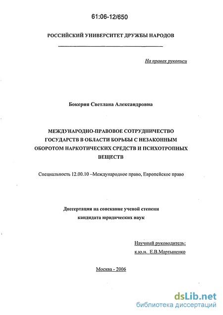 также для дальнейших научных исследований. К возможным сферам применения диссертационных положений можно отнести: научно-исследовательскую (в вопросе исследования явления незаконного оборота наркотиков как преступления международного характера и механизма международного сотрудничества в борьбе с этим социальным злом), правотворческую (в юридическом обеспечении процесса формирования правового государства), правоприменительную (в процессе деятельности соответствующих правоохранительных органов Российской Федерации и российского внешнеполитического ведомства), научно-образовательную (в процессе преподавания курса «Международное право» (разделы: международное уголовное право, право международных организаций и т.п.), при подготовке юристов, работников правоохранительных органов, которые занимаются практической работой в этой сфере и информационно-аналитическую (в работе учреждений, имеющих отношение к международному контролю над наркотиками и осуществляющих координационные мероприятия в государстве по проблеме борьбы со злоупотреблением наркотиками и их незаконным оборотом).