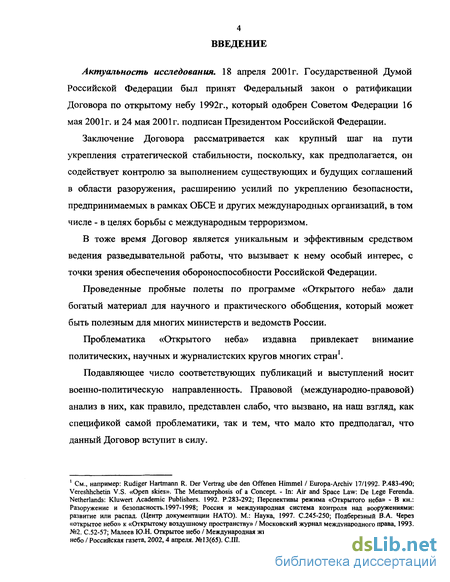 Актуальность исследования. 18 апреля 2001г. Государственной Думой Российской Федерации был принят Федеральный закон о ратификации Договора по открытому небу 1992г., который одобрен Советом Федерации 16 мая 2001г. и 24 мая 2001г. подписан Президентом Российской Федерации.