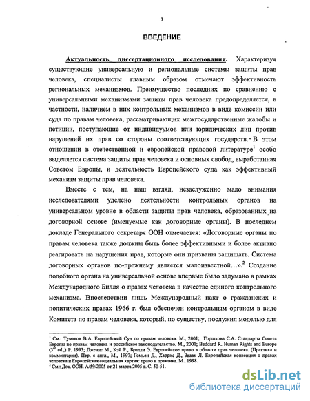 Степень разработанности темы диссертации. В отечественной доктрине международного права деятельности Комитета по правам человека уделено недостаточное внимание. Единственное фундаментальное исследование, касающееся деятельности Комитета по правам человека, было проведено Б.Г. Мановым почти 20 лет назад1. В работах по правам человека, вышедших в свет за последние десять лет, положения, относящиеся к деятельности Комитета по правам человека, носят, как правило, справочный характер. Несмотря на то, что в рамках ООН опубликованы материалы, связанные с деятельностью Комитета по правам человека, тем не менее в современной отечественной доктрине международного права отсутствуют комплексные фундаментальные исследования деятельности данного Комитета. В российской юридической литературе в этом отношении имеются лишь отдельные научные статьи, которые не раскрывают тему, вынесенную в заголовок настоящей диссертации.3 Вместе с тем такого рода научное исследование востребовано наукой и практикой современного международного права.
