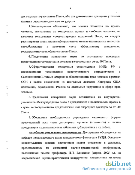 Практическая значимость работы. Материалы диссертации могут быть использованы МИДом РФ при подготовке очередного доклада Российского Федерации по ст. 40 Международного пакта о гражданских и политических правах, российскими экспертами в различных договорных органах по правам человека системы ООН, в процессе преподавания курса «Международное право», спецкурса «Международная защита прав человека», в дальнейших исследованиях в области защиты прав человека, а также отечественными правозащитными организациями.