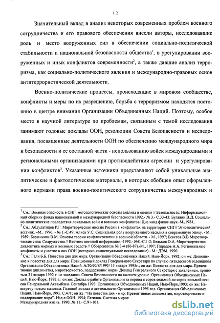 Военно-политические процессы, происходящие в мировом сообществе, конфликты и меры по их разрешению, борьба с терроризмом находятся постоянно в центре внимания Организации Объединенных Наций. Поэтому, особое место в научной литературе по проблемам, связанным с темой исследования занимают годовые доклады ООН, резолюции Совета Безопасности и исследования, посвященные деятельности ООН по обеспечению международного мира и безопасности и ее составной части - использованию войск международными и региональными организациями при противодействии агрессии и урегулировании конфликтов3. Указанные источники представляют собой уникальные аналитические и фактологические материалы, в которых обобщен опыт оформленного нормами права военно-политического сотрудничества международных и региональных организаций в интересах использования войск в превентивных действиях и операциях по поддержанию мира.