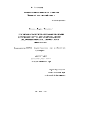 На данный момент в республике еще не сооружен ни одного ЭК на базе ВИЭ. Применение энергетических комплексов в высокогорных районах и отдаленных от центральных электрических сетей районах в Таджикистане является до сих пор не изученным вопросом, и исследования проведенные автором данной диссертационной работы, являются первой ступенью к решению этой важнейшей задачи. Сначала должны быть достаточно изучены все необходимые параметры и характеристики каждого источника возобновляемой энергии, выявлено эффективное соотношение в ЭК и исследованы режимы их совместной работы.