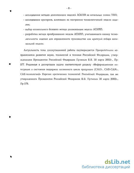 Актуальность темы диссертационной работы подтверждается Приоритетными направлениями развития науки, технологий и техники Российской Федерации, утвержденными Президентом Российской Федерации Путиным В.В. 30 марта 2002г., Пр-577. Решаемые в диссертации задачи соответствуют разделу «Информационная интеграция и системная поддержка жизненного цикла продукции (CALS-, CAD-CAM-, САЕ-технологии)* Перечня критических технологий Российской Федерации, так же утвержденного Президентом Российской Федерации В.В. Путиным 30 марта 2002г., Пр-578.