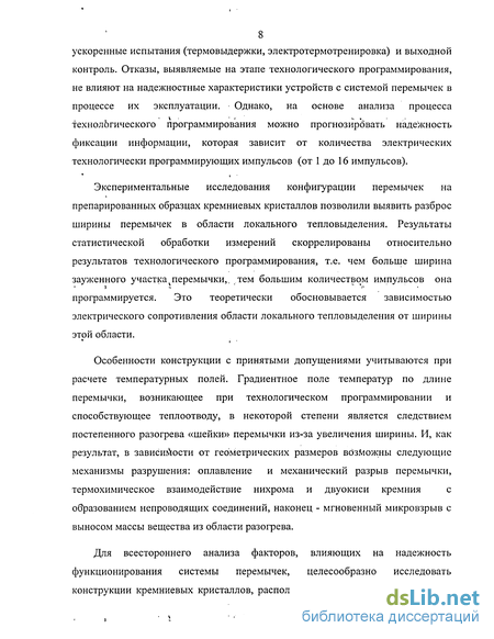 высоких температурах осаждением из газовой среды, а это значит, что оно сопровождается термодинамическими и термохимическими изменениями в структуре. Так, на стадии изготовления элементов управления процессом фиксации и считывания информации в системе перемычек в толще кремния возникают дефекты кристаллической решетки, дефекты наращиваемых слоев, что является в незначительной степени причиной возникновения отказов, обычно выявляемых на входном контроле или в процессе ускоренных испытаний. На стадии окисления кремния и создания диэлектрического защитного слоя основной задачей является формирование однородного слоя одинаковой толщины по всей поверхности кремниевого кристалла, без пор, которые могут явиться причиной возникновения отказов из-за пробоя диэлектрика.