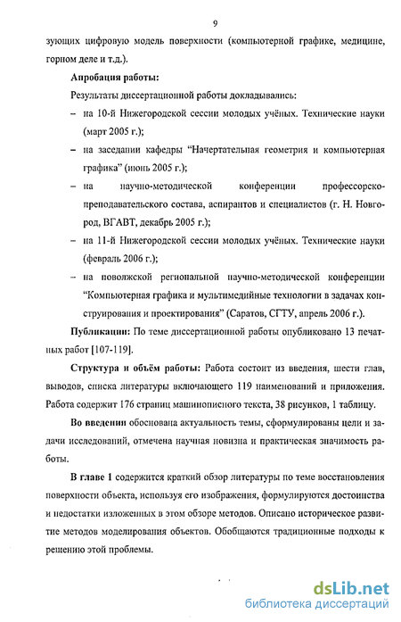 Теоретическая и практическая ценность: В диссертации, выполненной в рамках фундаментальной НИР "Разработка теоретических основ алгоритмов и программ геометрии и графики для параллельных технологий проектирования" (ГР № 01970004538, Нижегородский государственный архитектурно-строительный университет), предложены методы, позволяющие автоматизировать процесс восстановления поверхности объекта по его изображениям. На основе этих подходов создан программный комплекс, проводящий бесконтактные измерения на поверхности объекта с ярко выраженными контурами. Предложенная в диссертационной работе методика реконструкции сложной поверхности объекта также может быть использована в различных областях, исполь-