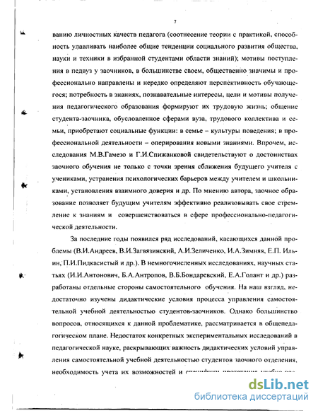 Архангельский, В.П.Беспалько, Е.В.Бондаревская, М.А.Вейт, М.Я.Виленский, Ф.Н.Гоноболин, В.И.Загвязинский, С.И.Зиновьев, И.Ф.Исаев, Н.В.Кузьмина, Е.А.Леванова, М.М.Левина, Е.Г.Силяева, В.А.Сластенин, Т.Д.Суслова, Н.Ф. Талызина, В.Э.Тамарин, Е.Н.Шиянов и др.); на исследованиях, посвященных теоретическим основам самостоятельной учебной деятельности (Б.И.Есипов, В.И.Загвязинский, И.А.Зимняя, И.Я.Лернер, М.И.Махмутов, Е.Н.Медынский, П.И.Пидкасистый, Л.И.Рувинский, М.Н.Скаткин); на исследованиях проблемы заочного обучения студентов (И.А.Камков, Е.А.Козаков, И.Я.Огурцов, В.К.