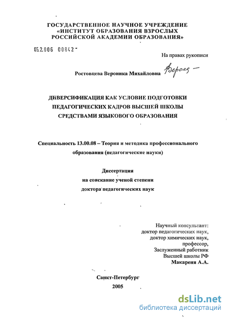 Предмет исследования - пути осуществления диверсификации как условия подготовки педагогических кадров высшей школы средствами языкового образования.