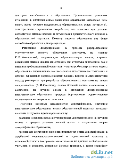 Реализация диверсификации в процессе реформирования отечественного высшего образования заимствует, по мнению С. В. Кохановской4 американскую образовательную модель, «причем российской высшей школой заимствованы как структура образования, так и названия профессиональной ориентации — магистр, бакалавр, а также формы образования — дистанционное вместо заочного, педагогические технологии и другие». Ориентация на рекомендуемый Советом Европы компетентностный подход реализуется при разработке образовательных программ по новым специальностям (А. И. Сеселкин), однако большей частью имплицитно; к сожалению, на научной основе в отношении диверсификации педагогического образования, процесса формирования педагогического корпуса вузов эти вопросы не ставились.