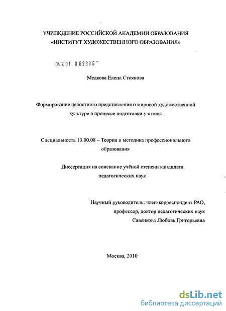 Предмет исследования: содержание и специфика организации процесса обучения, направленного на формирование у учителя целостного представления о мировой художественной культуре.