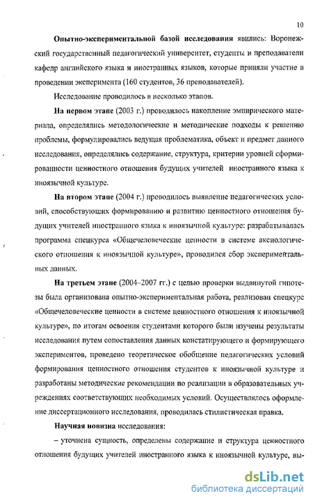 На третьем этапе (2004-2007 гг.) с целью проверки выдвинутой гипотезы была организована опытно-экспериментальная работа, реализован спецкурс «Общечеловеческие ценности в системе ценностного отношения к иноязычной культуре», по итогам освоения студентами которого были изучены результаты исследования путем сопоставления данных констатирующего и формирующего экспериментов, проведено теоретическое обобщение педагогических условий формирования ценностного отношения студентов к иноязычной культуре и разработаны методические рекомендации по реализации в образовательных учреждениях соответствующих необходимых условий. Осуществлялось оформление диссертационного исследования, проводилась стилистическая правка.