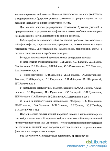 Изучение опыта работы высшей и средней школы, а также анализ философской, социологической, юридической, психологической и педагогической литературы позволяют нам утверждать, что в рассматриваемой проблематике не изучены в должной мере вопросы предупреждения и разрешения конфликтов в школе средствами юмора.