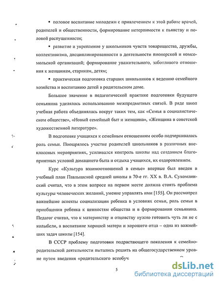 Курс «Культура взаимоотношений в семье» впервые был введен в учебный план Павлышской средней школы в 70-е гг. XX в. В.А. Сухомлин-ский считал, что в этом вопросе на первом месте должна стоять проблема культуры человеческих желаний, умение управлять ими [155]. Он рассмотрел важнейшие аспекты социализации ребенка в условиях семьи, роль семьи в приобщении ребенка к ценностям общества и в формировании семьянина. Педагог считал, что к материнству и отцовству нужно готовить чуть ли не с колыбели, а воспитание хорошей матери и хорошего отца - одна из важнейших задач школы [154].