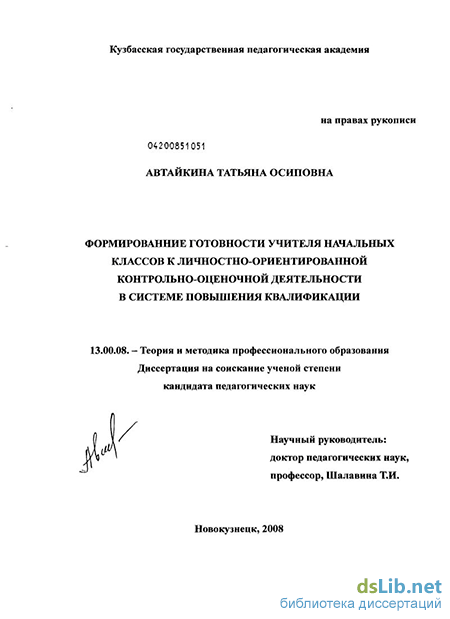 Проведенный нами теоретический анализ показал, что готовность учителя к контрольно-оценочной деятельности рассматривается, как правило, относительно профессиональной подготовки будущих учителей-студентов педагогического вуза. Целенаправленные исследования готовности учителя-практика к личностно-ориентированнои контрольно-оценочной деятельности в системе повышения квалификации нами не выявлены.