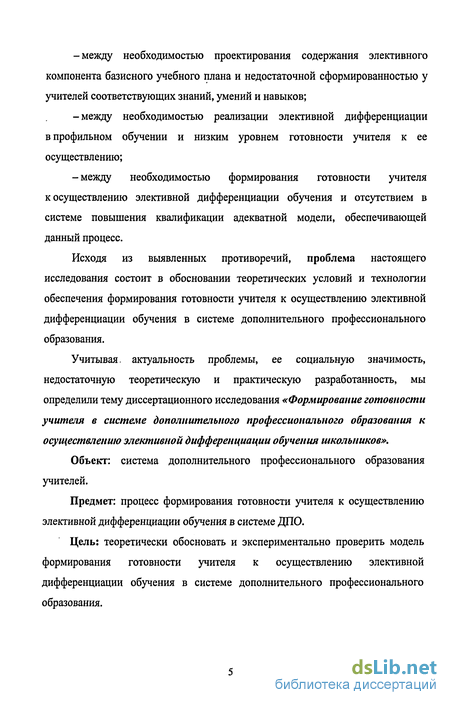 Учитывая, актуальность проблемы, ее социальную значимость, недостаточную теоретическую и практическую разработанность, мы определили тему диссертационного исследования «Формирование готовности учителя в системе дополнительного профессионального образования к осуществлению элективной дифференциации обучения школьников».
