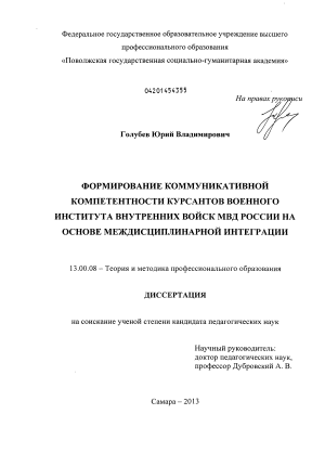 - Методика формирования коммуникативной компетентности курсантов военного института внутренних войск МВД России на основе междисциплинарной интеграции