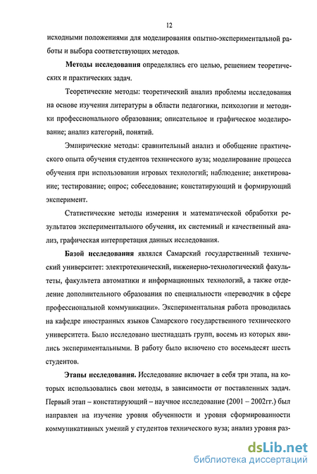 Этапы исследования. Исследование включает в себя три этапа, на которых использовались свои методы, в зависимости от поставленных задач. Первый этап - констатирующий - научное исследование (2001 - 2002гг.) был направлен на изучение уровня обученности и уровня сформированности коммуникативных умений у студентов технического вуза; анализ уровня раз-
