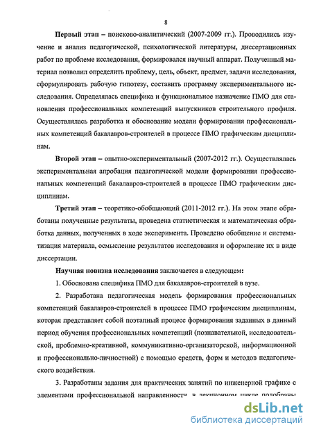 8. Апробированы научно-практические рекомендации в цикле графических дисциплин по формированию условий, направленных на развитие профессиональной мотивации, для становления профессиональных компетенций бакалавров-строителей. Разработаны и применены в учебном процессе курса «Инженерная графика» Братского государственного университета следующие педагогические мероприятия профессионально-мотивирующего обучения: введение в учебный курс инженерной графики тщательно проработанных и классифицированных примеров использования графической информации в архитектурной и строительной деятельности человечества, начиная от древнего мира до современных дней, что значительно активизирует интерес студентов к изучаемой дисциплине и будущей профессиональной деятельности; организация поэтапного усвоения материала дисциплины в привязке к применению в профессиональной деятельности, с помощью профессионально-ориентированных упражнений, тестов и задач; анализ усвоения полученных знаний, умений и навыков, выявление, складывающейся у студентов самооценки о владении полученными знаниями; создание условий для проявления активности студентов, на примере деятельности студенческого конструкторского бюро.