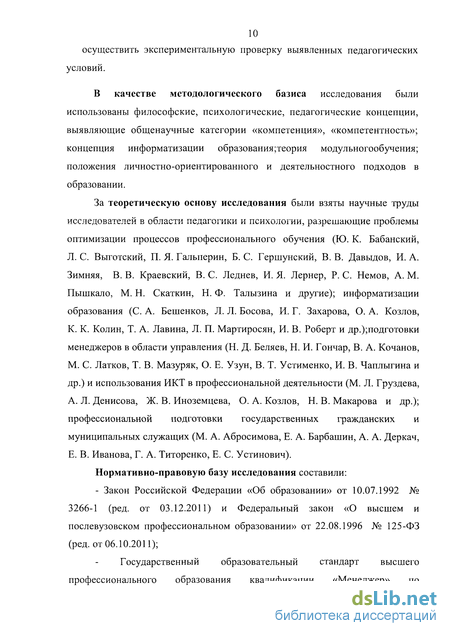 За теоретическую основу исследования были взяты научные труды исследователей в области педагогики и психологии, разрешающие проблемы оптимизации процессов профессионального обучения (Ю. К. Бабанский, Л. С. Выготский, П. Я. Гальперин, Б. С. Гершунский, В. В. Давыдов, И. А. Зимняя, В. В. Краев-ский, В. С. Леднев, И. Я. Лернер, Р. С. Немов, А. М. Пышкало, М. Н. Скаткин, Н. Ф. Талызина и другие); информатизации образования (С. А. Бешенков, Л. Л. Босова, И. Г. Захарова, О. А. Козлов, К. К. Колин, Т. А. Лавина, Л. П. Мартиросян, И. В. Роберт и др.); подготовки менеджеров в области управления (Н. Д. Беляев, Н. И. Гончар, В. А. Кочанов, М. С. Латков, Т. В. Мазуряк, О. Е. Узун, В. Т. Устименко, И. В. Чаплыгина и др.) и использования ИКТ в профессиональной деятельности (М. Л. Груздева, А. Л. Денисова, Ж. В. Иноземцева, О. А. Козлов, Н. В. Макарова и др.); профессиональной подготовки государственных гражданских и муниципальных служащих (М. А. Абросимова, Е. А. Барбашин, А. А. Деркач, Е. В. Иванова, Г. А. Титоренко, Е. С. Устинович).